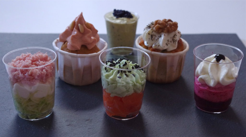 Après le Bar à soupes, suite du buffet pour 50 avec les verrines et les bouchées salées. De même que j’avais fait 4 soupes, j’avais préparé 4 verrines et 4 bouchées salées. Un résultat coloré, gourmand et j’espère Fashion…