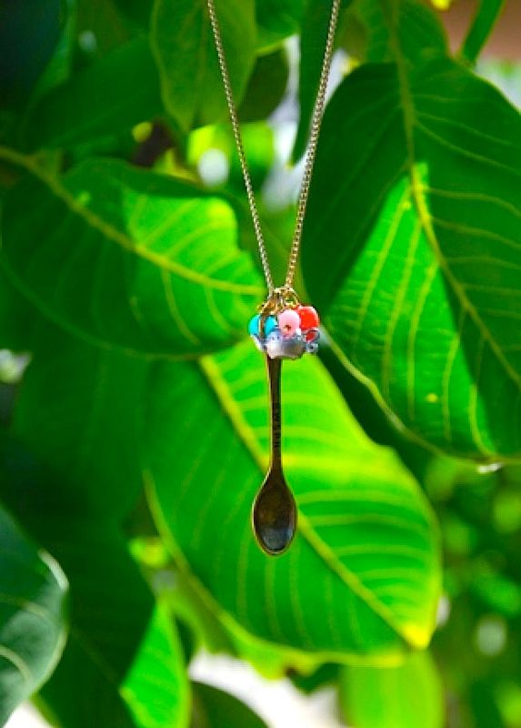 Je ne parle pas souvent de moi alors voici quelques infos: je suis passionnée de cuisine certes mais je suis aussi fan de mode et j’adore le thé. J’en bois au minimum un litre par jour, du thé vert parfumé exclusivement, toujours du Palais des thés avec parfois quelques infidélités pour du Kusmi tea (en allant sur Kusmi cooks tea notamment). Alors quand j’ai vu ce collier chez Allison (3 rue de Buci, Paris 6°), j’ai immédiatement craqué! Celui-là il me le fallait pour compléter ma collection de sautoirs pourtant déjà bien remplie. Je suis incapable de dire le nom de sa marque mais je l’aime beaucoup. Mon amoureux a déclaré que c’était mon Blaz’ (sorte de signature en langage “jeune-branché”). N’est-il pas mignon avec sa cuillère et sa petite théière?
