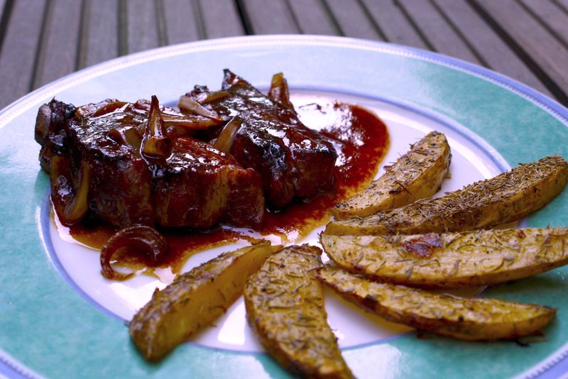 Pour la fête des pères, je voulais faire un plat original pour le diner familial. J’ai préparé des Spare ribs, plat que j’avais goûté (et adoré) dans la famille de MiniCook, et dont la recette a été directement importé de Louisiane par le chef de famille. Il s’agit de travers de porcs marinés dans une sauce aigre-douce à base de ketchup et traditionnellement cuits au barbecue. Yummy!!! Je les avais accompagnés de potatotes maison, l’occasion de tester la super recette de “frites sans fritures” de Julie Andrieu tirée de son livre Mes secrets pour garder la ligne… sans régime