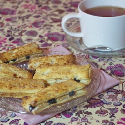 Le thème de l’émission de ce soir: Les feuilletés. J’avais envie de l’illustrer avec une recette mais j’étais un peu à sec en terme d’inspiration jusqu’à ce que MiniCook me parle de ses biscuits d’enfance préférés, les “Sirtaki”. Je n’avais jamais entendu parler de ces biscuits LU désormais re-commercialisés par St Michel (ben oui du coup j’ai fait mes petits recherches…). Bon toujours est-il que ce sont des biscuits feuilletés aux raisins de Corinthe, donc pile dans le thème des feuilletés! Après étude des photos desdits biscuits et description détaillée du goût et de la consistance par MiniCook, je me suis lancée. Dixit MiniCook, c’était très proche et dixit moi qui n’avait pas de point de comparaison c’était très très bon et parfait à l’heure du thé. On a englouti la fournée à deux en 20mn.