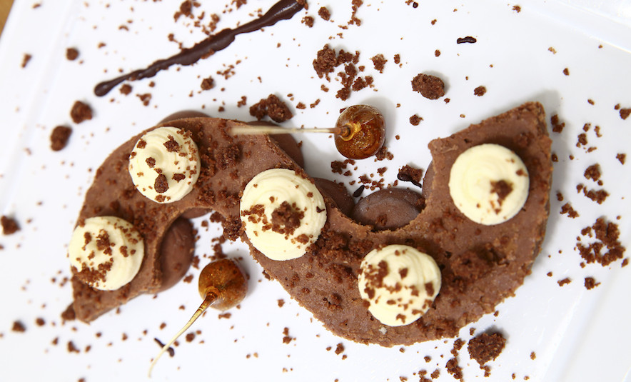 - Découpez 4 « S » dans la plaque de croustillant praliné. Pochez des noix de crémeux chocolat en forme de « S » sur l’assiette. Faites prendre 15mn au congélateur.