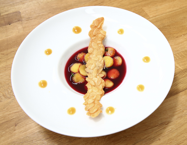 - Versez une ou 2 louches de sirop d’hibiscus refroidi sur les nectarines. Parsemez de menthe fraîche ciselée et surmontez le tout d’une tuile incurvée. Dessinez quelques points de coulis de nectarine tout autour de l’assiette avec une cuillère plume.